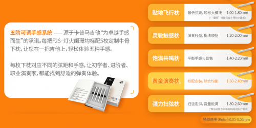 手感,是吉他爱好者,尤其是初学者最为关心的问题。据统计,高达70%的初学者因糟糕的手感而放弃 。卡普马(Kepma)深谙此道,在F2S·灯火阑珊上开创性地推出了“五阶可调手感系统”,让一把吉他拥有五种不同的手感体验 。该系统通过配备五个由真牛骨精心打磨的可替换下枕,来精准调节弦距,满足从初学者到职业演奏家的不同需求 。