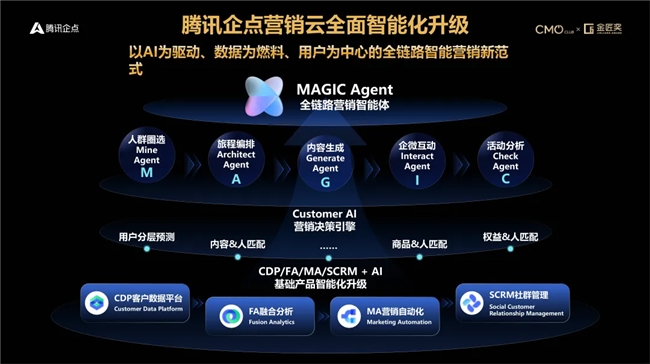 二、企业营销正从传统营销云1.0 向智能营销云2.0 转型,腾讯企点营销云构建以AI 为驱动、数据为燃料、用户为中心的全链路智能营销范式,核心是MAGIC 增长方法论与全链路营销智能体。产品升级聚焦三大方向:一是基础工具智能化,含智能分群、辅助画布生成等场景;二是营销决策引擎,通过大模型+ 机器学习实现用户分层预测、人货场/ 内容/ 权益匹配及AIGC 内容生成;三是MAGIC Agent 多Agent 体系,覆盖人群圈选、旅程编排等全业务环节,助力运营人员高效完成复杂营销活动。