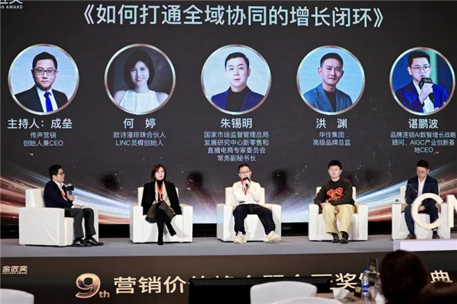 传声营销创始人兼CEO成垒、欧诗漫珍珠合伙人&LINC 灵樨创始人何婷、国家市场监督管理总局发展研究中心新零售和直播电商专家委员会常务副秘书长朱锡明、华住集团高级品牌总监洪渊、品牌连锁 Al 数智増长战略顾问AIGC 产业创新基地 CEO谌鹏波围绕“全域≠全渠道堆砌:如何定义真正有效的全域运营架构?市场与销售的“全域对齐”:如何设计跨部门的KPI与激励机制?从自动化触达到个性化体验的跃迁:AI如何赋能全域运营提效?”三大议题展开讨论,探讨了“企业如何打通全域协同的增长闭环”议题。