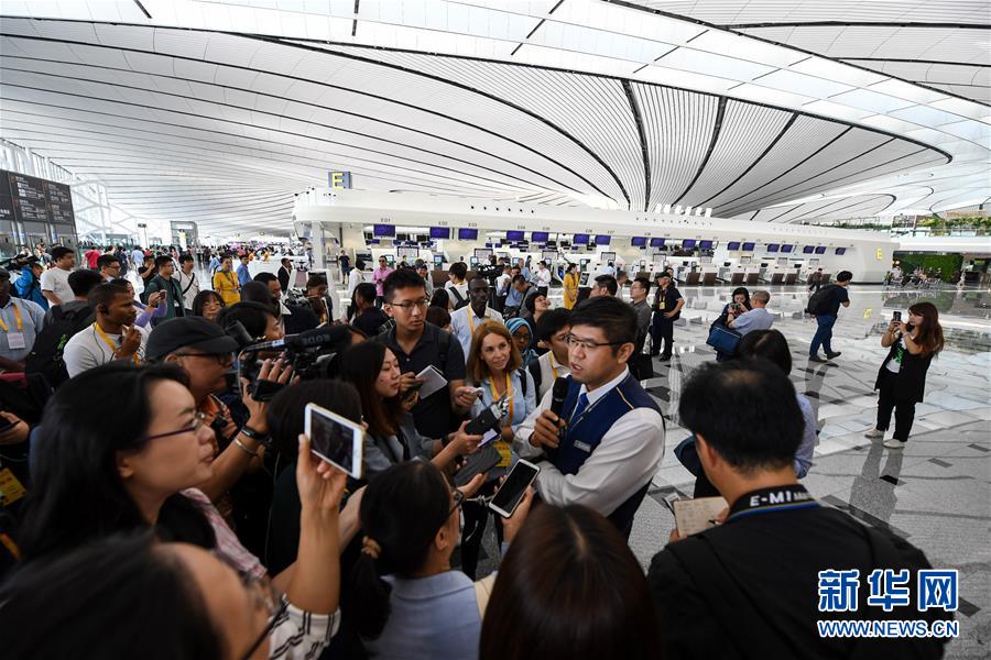 9月28日,工作人员为记者介绍北京大兴国际机场航站楼的构建情况。 当日,庆祝新中国成立七十周年活动新闻中心、北京市人民政府新闻办公室邀2019年09月30日 07:56