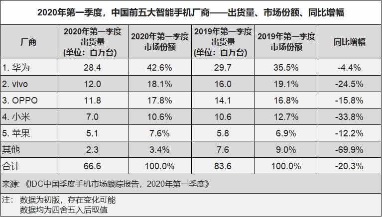 一季度手机出货量:华为降幅最小 但市场份额提升到